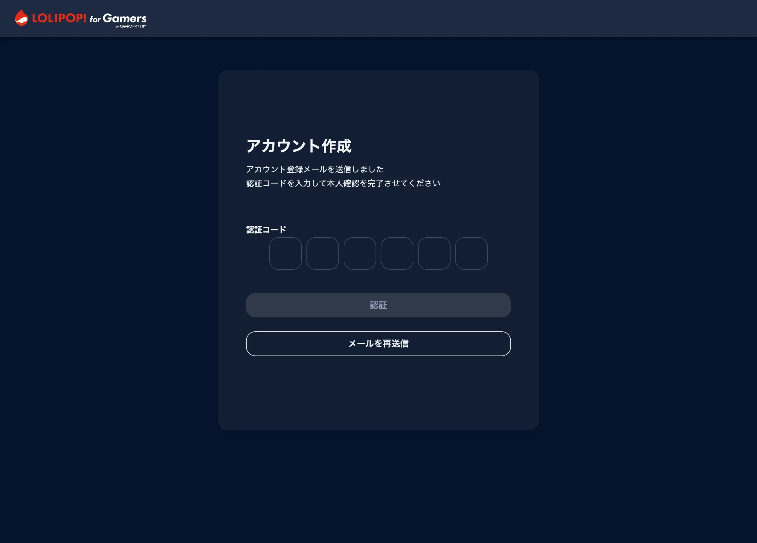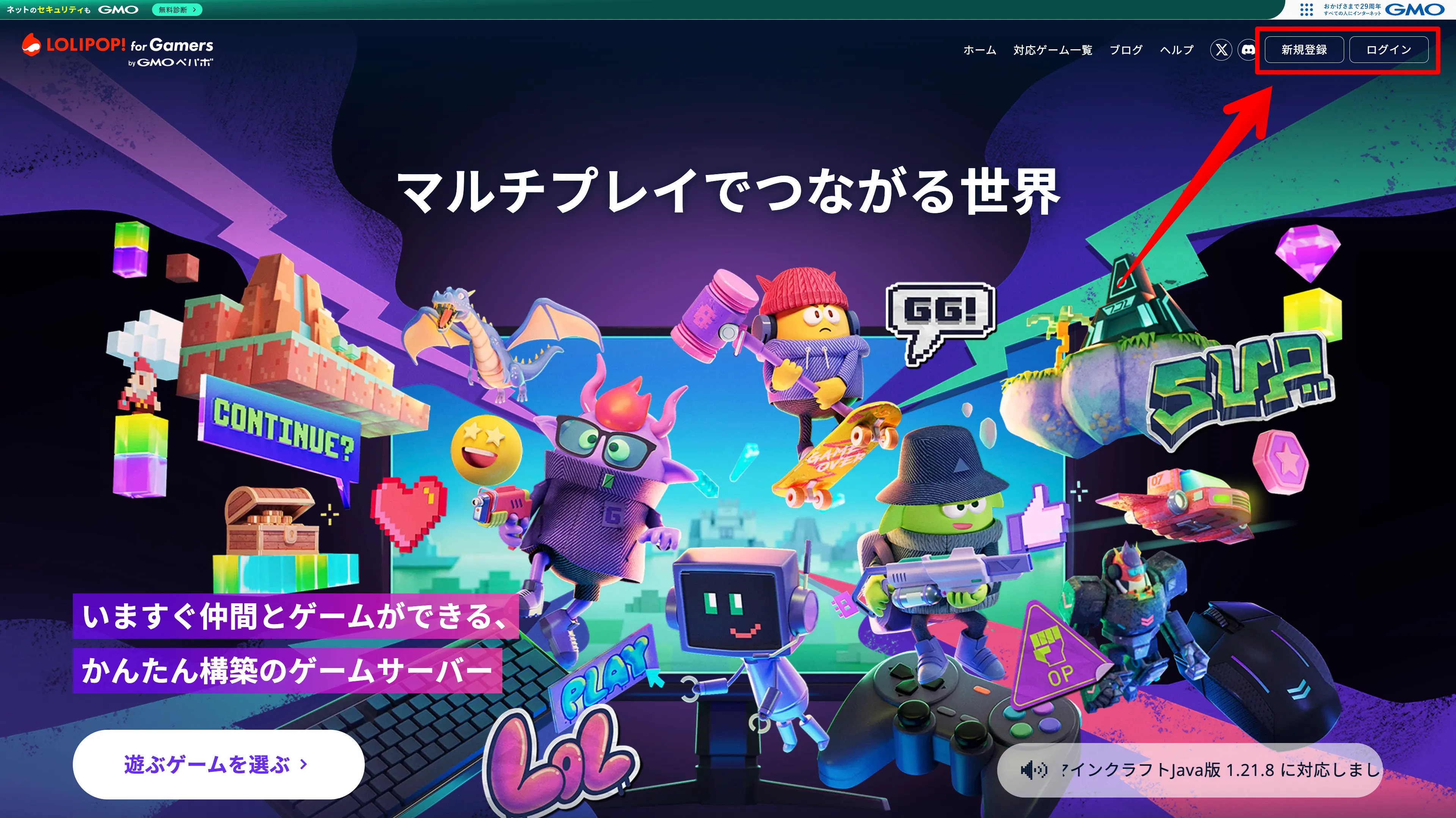 ロリポップ for Gamersのアカウント作成ページ にアクセスし、画面右上の「新規登録」ボタンをクリックします。