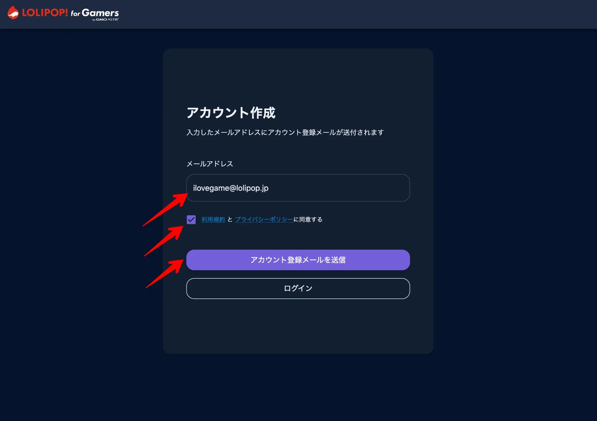「利用規約とプライバシーポリシーに同意する」にチェックを入れて、「アカウント登録メールを送信」をクリックします。