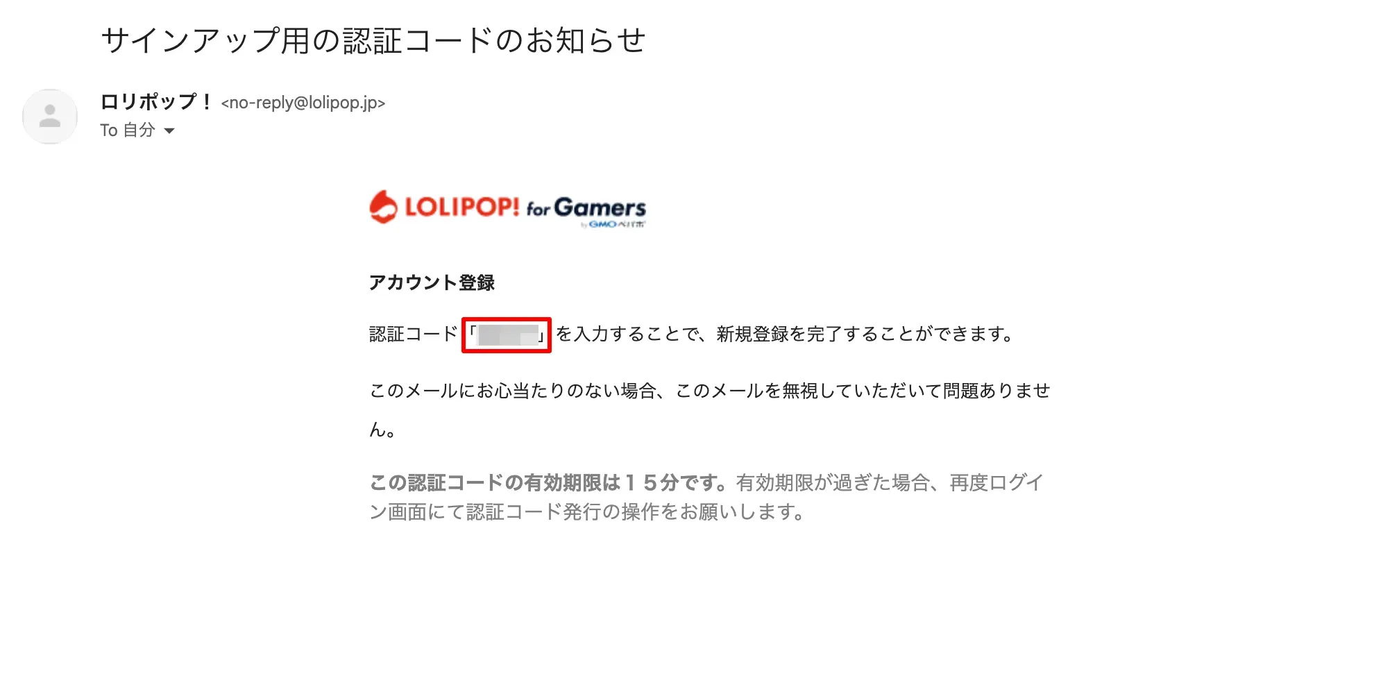入力したメールアドレス宛に、メールタイトル「サインアップ用の認証コードのお知らせ」のメールが届きます。