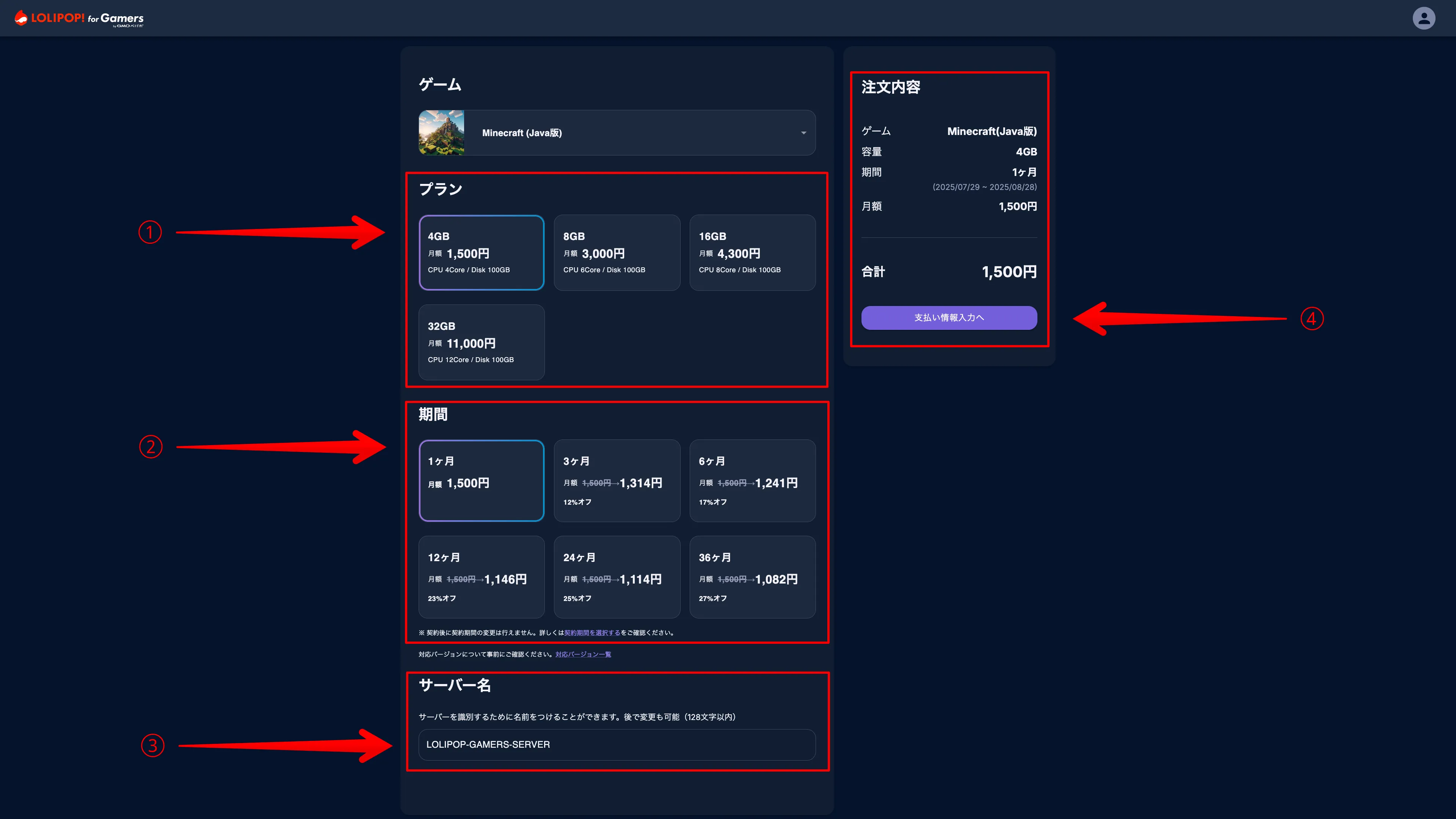 ①でご希望のプランを選択します。マイクラは4GBプラン、8GBプラン、16GBプラン、32GBプラン、64GBプラン、128GBプランの6つのプランを提供しております。